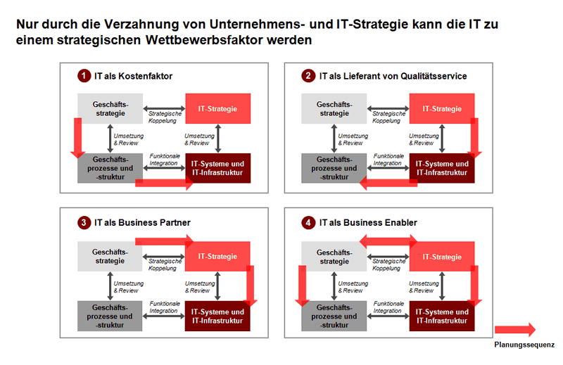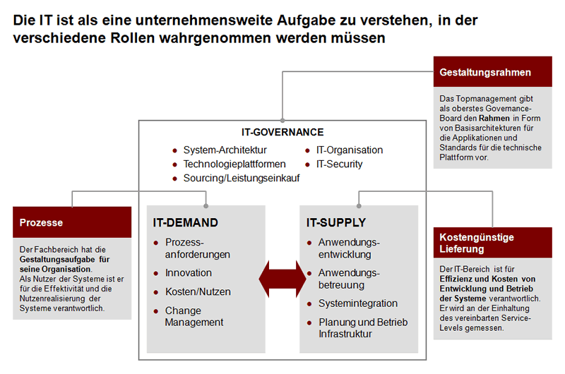 IT ist als unternehmensweite Aufgabe zu verstehen, in der verschiedene Rollen wahrgenommen werden müssen: IT-Governance, IT-Demand und IT-Supply. Durch die Abstimmung von Unternehmens- und IT-Strategie wird IT zu einem strategischen Wettbewerbsfaktor im Sinne eines Business Enablers.