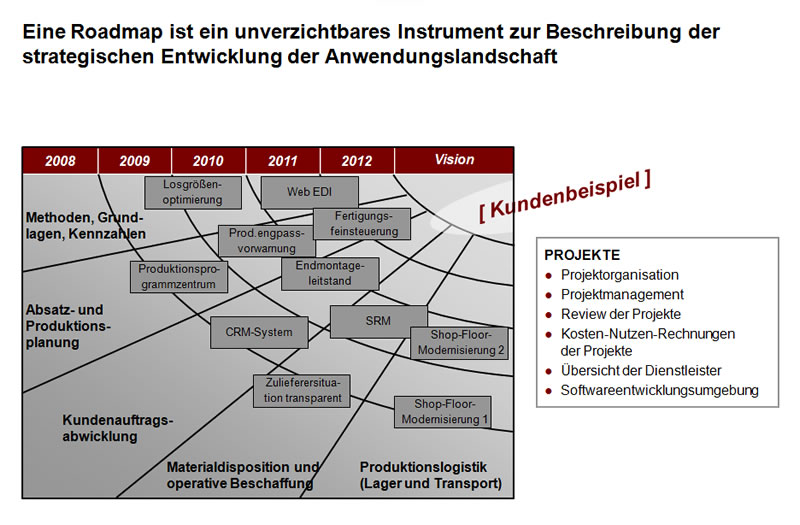 Eine Roadmap ist zur Beschreibung der strategischen Entwicklung der Anwendungslandschaft ein unverzichtbares Instrument. Eine präzise Ebenenstruktur in der Anwendungslandschaft gewährleistet eine schnelle und kostengünstige Entwicklung sowie einen sicheren Betrieb.